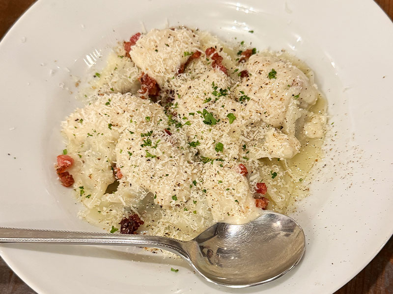・スロバキア風水餃子: 洋食店で水餃子?という意外性に惹かれて注文。たっぷりのチーズが絡むスロバキア風の仕上がりは、ワインとの相性が抜群で「大当たり」な一皿だ。