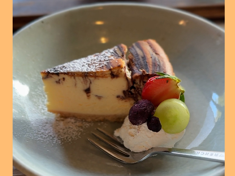 • 充実のメニュー: スイーツはもちろん、お食事やお酒も楽しめるのが嬉しいポイント。キングが堪能した「チョコレートマーブルチーズケーキ」は、濃厚ながらも上品な味わいで、まさに「うまキング!」な一品だ。